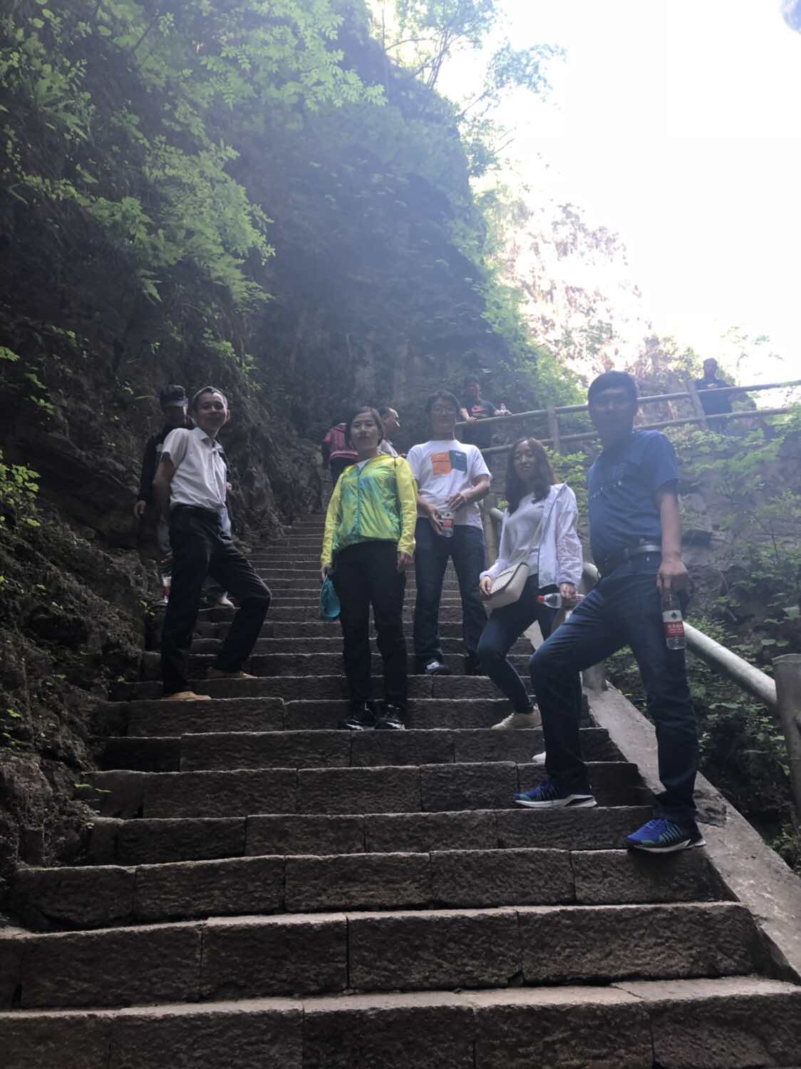 團建活動part 4:游覽“天下第一峽” 團建第二天我們要去到的是被譽為“天下第一峽”的百里峽景區,聽聞百里峽天梯有三千余階,可是嚇死“寶寶們”呢,幸好經過一夜的休息,大家精力已恢復大半。 走在狹窄的峽谷中,駐足而望,兩側聳然屹立的翠色絕壁,頭頂上若隱若現的一線天光,遠處山巔的藍天白云,腳下忽左忽右的溪流……若不是那彩色纜車過于美好,“小芯”肯定是要徒步登上山頂的!沒錯,“小芯”真的是被纜車“色誘”過去的?。?!